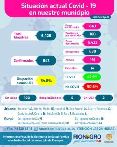 A la fecha Rionegro tiene un registro de 829 casos confirmados, de los cuales 196 continúan activos, 621 recuperados y 14 fallecidos. La ocupación de camas UCI está en 56%.