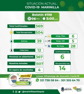 De esta forma el municipio registra hasta la fecha 569 casos confirmados de coronavirus, de los cuales 39 continúan activos, 504 recuperados y 12 fallecidos.