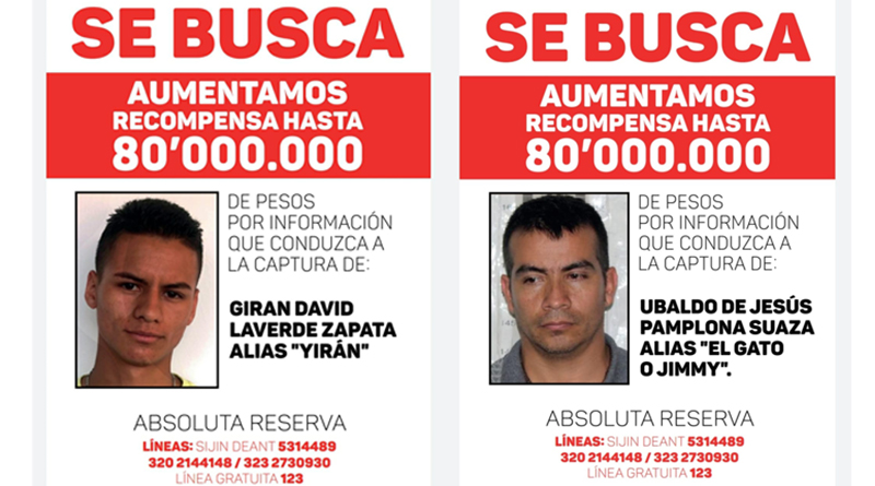 Este martes 14 de septiembre, a través de una rueda de prensa, el alcalde de Rionegro, Rodrigo Hernández, anunció el incremento de recompensa por información que permita la captura de Ubaldo de Jesús Pamplona Suaza, alias «El Gato o Jimmy» y Girán David Laverde Zapata, alias «Yirán».